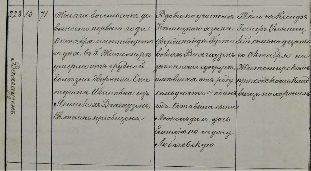 W indeksach luterańskich pojawia się Leopold Wachhausen syn Ferdynanda i Kathariny Jassińskiej. Ten Leopold odnajduje się w wołyńskim Adres Kalendarzu z 1892